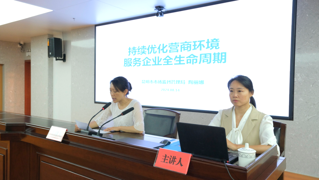 当晚,昆明市市场监督管理局登记注册处处长陶丽娜作题为《持续优化营商环境 服务企业全生命周期》的讲座。陶丽娜围绕营商环境概述、营商环境评价、营商环境相关政策等方面,详细讲授优化营商环境相关内容,对企业登记注册标准、典型案例和新公司法的重要变化进行深入讲解。