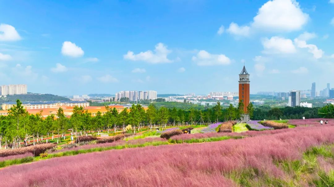 沿学校北门走进云南大学(呈贡校区),宽阔整洁的道路两旁绿树成荫。沿着道路向右前行,一个澄澈的湖泊呈现在眼前,湖中的鱼儿自由自在地游弋,许多黑天鹅悠闲地在湖面上嬉戏,这样的美景吸引了不少游客前来打卡。山顶和山间成片的薰衣草和粉黛乱子草花开得正艳,让人感受到大自然的和谐与美好。