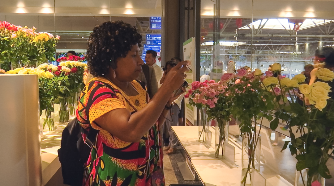 在数字云花展示厅,工作人员向中外媒体记者介绍了数字云花平台的基本情况,现场展示了平台部分功能。在拍卖交易大厅,鲜花买手正紧盯拍卖大钟上跳动的光标,紧张采购清单上的鲜花。