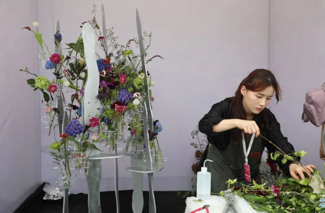 随着开赛一声令下,选手们立即拿起各自的工具,在独立的空间展开花艺。他们技法娴熟,布局、选材、剪枝、配色……巧妙构思、巧手搭配,根据花材、器皿、花泥等基础材料,现场创作出一个个主题鲜明、立意新颖的花艺作品,展现出精湛的专业技能、高超的现场应变能力及创新创造能力,让“匠心之美”在花间尽情绽放。