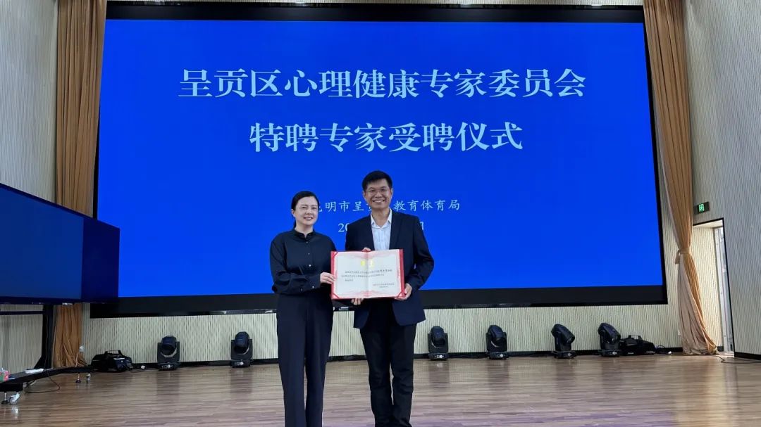 讲座开始前,区政府副区长龙晶晶代表呈贡区向席居哲博士颁发昆明市呈贡区心理健康专家委员会特聘专家证书。