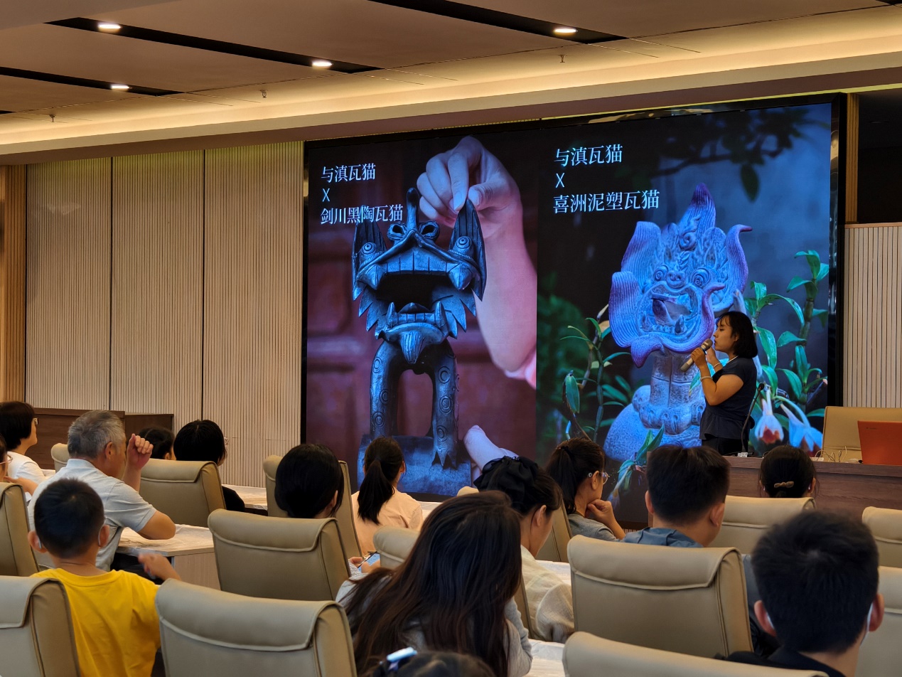 主讲老师从瓦猫的历史渊源讲起,深入浅出地阐述了其作为屋脊守护神、驱邪纳福、迎祥吉瑞的文化寓意。随后,老师通过丰富的图片资料,生动展示了云南不同地域,如剑川黑陶瓦猫与喜洲泥塑瓦猫的造型特点与风格差异,每一只瓦猫都凝聚着当地的风土人情与匠人的独特巧思。伴随着一幅幅实物图片的展示,不少家长轻声为孩子讲解,让非遗文化在潜移默化中传递。