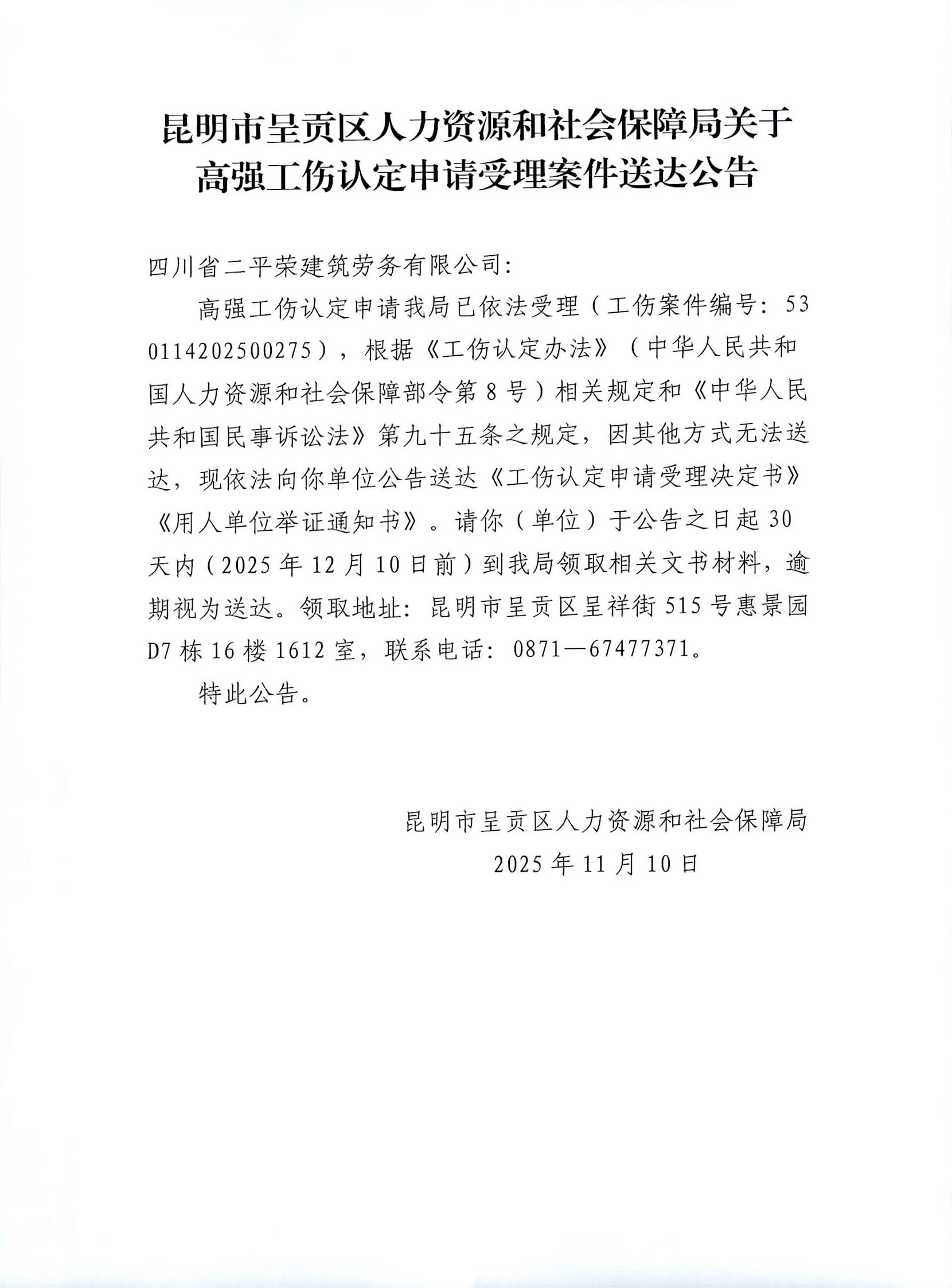 昆明市呈贡区人力资源和社会保障局关于高强工伤认定申请受理送达公告