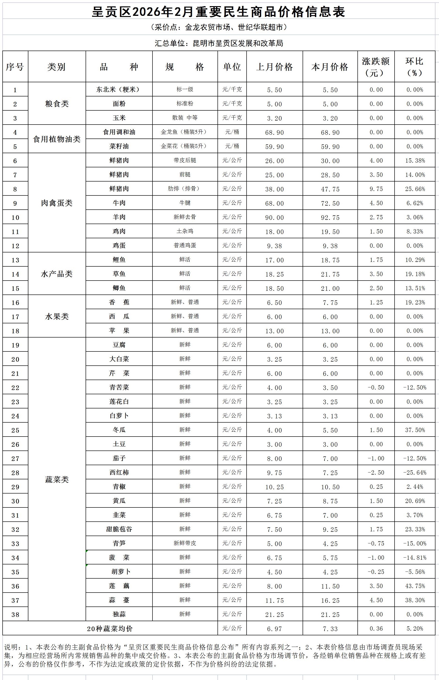 呈贡区2026年2月重要民生商品价格信息表