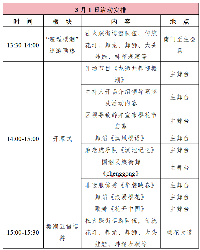 开幕式当天下午,花灯、板凳龙、舞狮等民俗表演队伍沿公园主干道巡游互动;公园设“福、禄、寿、喜、财”五大主题体验区,特色NPC驻守并设置翻牌、掷骰子等趣味游戏,市民凭“通关文牒”集章,集齐可兑换祈福河灯,参与夜樱祈福、观赏非遗打铁花。