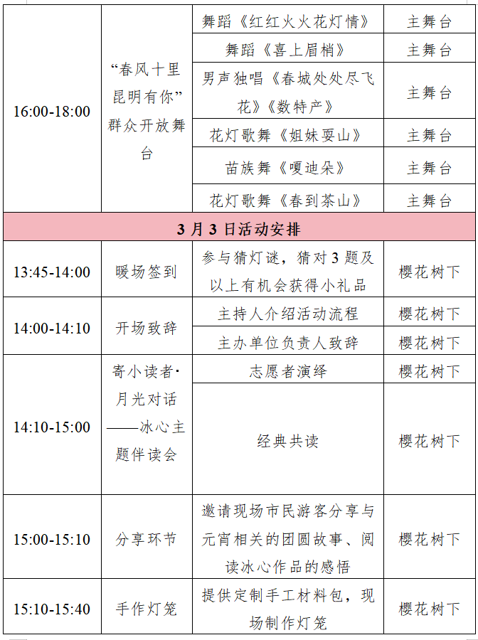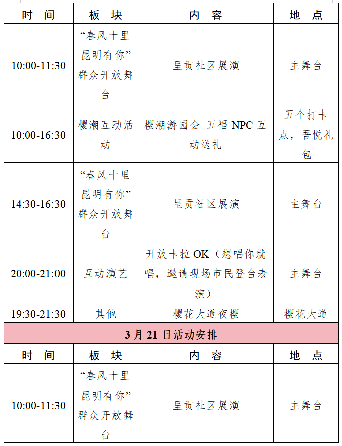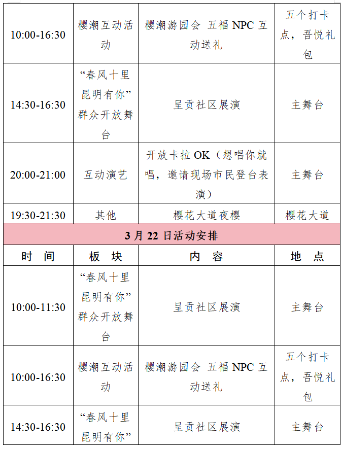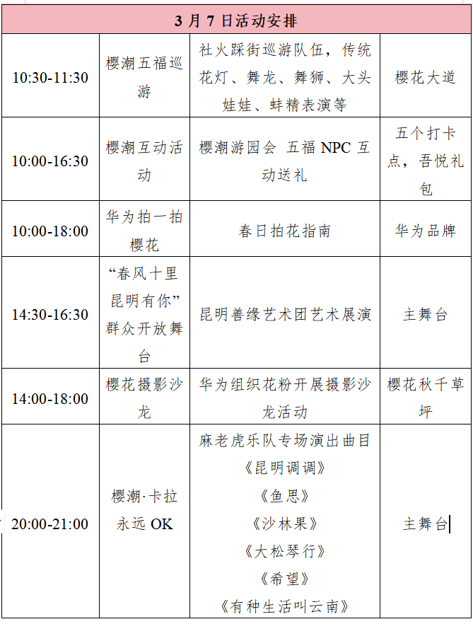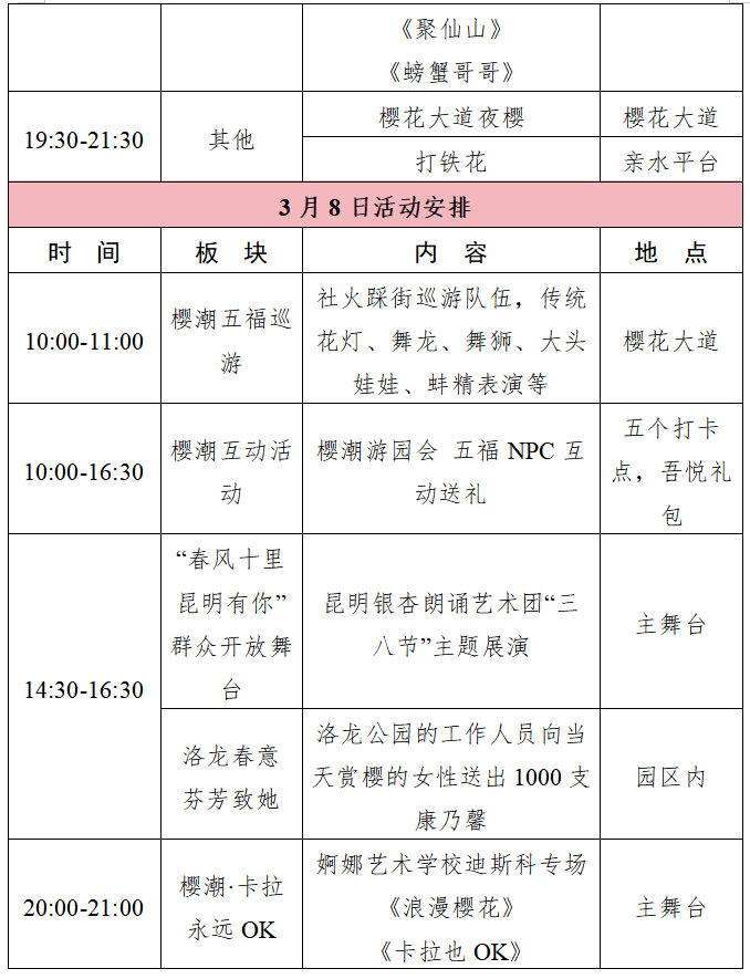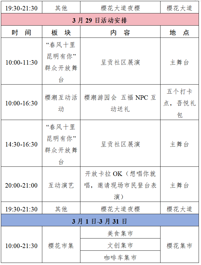 3月1日起,樱潮“赶街”市集持续整花期,汇集老昆明特色美食、本土文创及怀旧玩具,以樱花粉配老昆明阴丹蓝美陈,打造复古清新氛围;主舞台打造“百姓开放舞台”,白天有本地文艺团队带来花灯、歌舞表演,夜晚开启经典老歌欢唱派对,邀游客夜樱下互动欢娱。