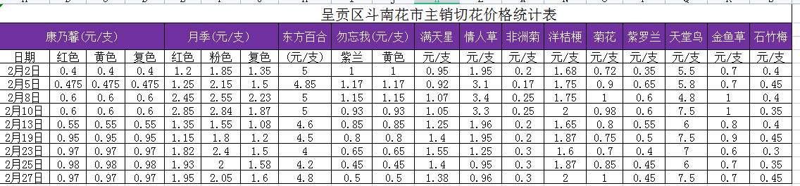 呈贡区斗南花市主销切花2026年2月价格统计表