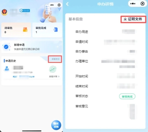八、完成申请后,受理单位将在3个工作日内完成审批。可在首页【申请历史】中查看对应申请详情及下载电子证明。